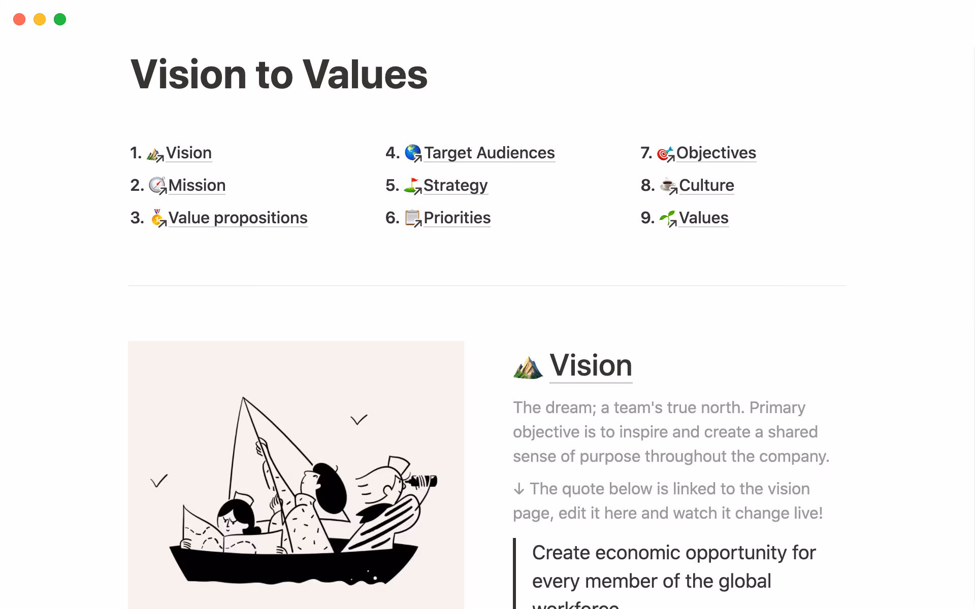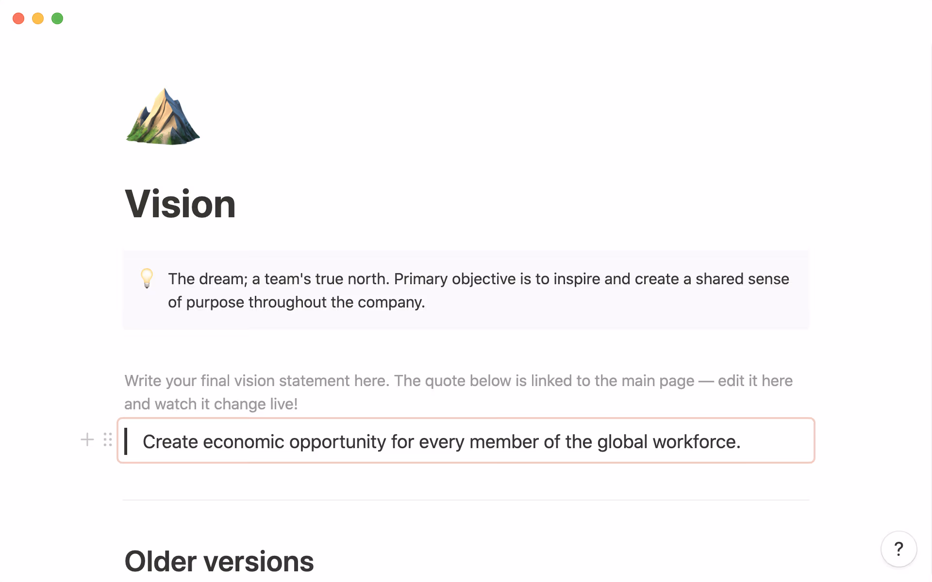 Your Vision to Values one-pager should be visible to everyone in the company, but you also don't want people to delete anything important. To avoid this, you can lock the page so that everyone can access it without accidentally editing it. You can also share the page with certain people and set read-only permissions.